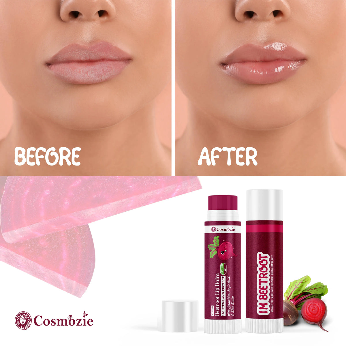 Pamper your lips with Cosmozie Beetroot Lip Balm SPF 50 PA++++, a nourishing tinted lip balm designed to protect, hydrate, and naturally brighten your lips every day. Infused with beetroot extract, it adds a soft rosy tint while keeping your lips healthy and smooth.