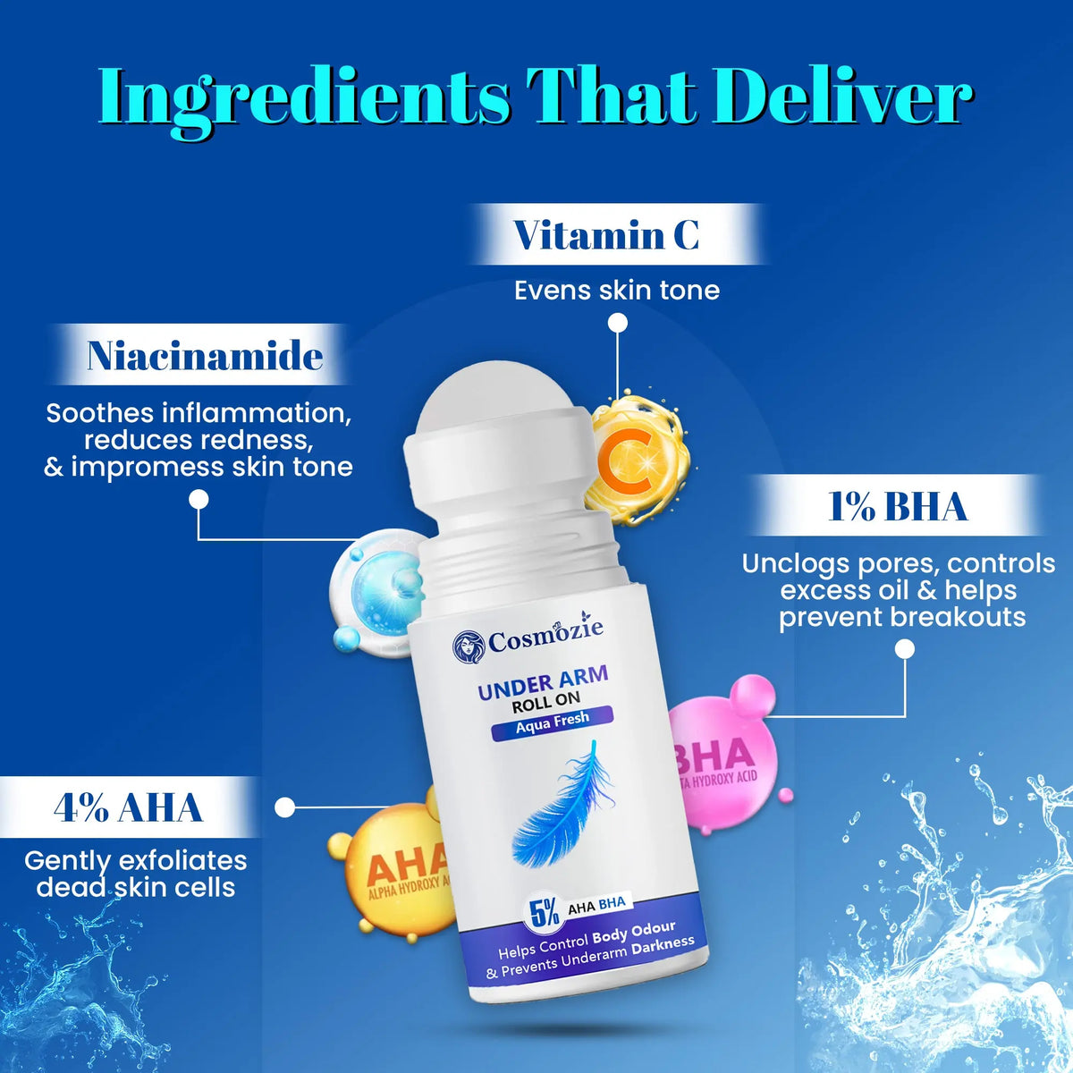 Cosmozie Underarm Roll-On for Men & Women | 48H Odour Control | Skin Whitening, Smoothening & Freshness | Alcohol-Free Natural Deodorant